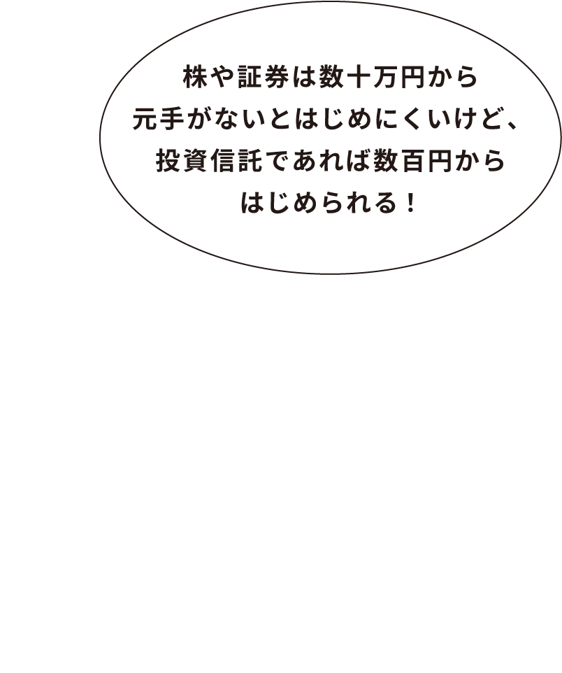 投資信託は多くの個人から資金を集めるため、一人ひとりの投資は少額でも成り立つ仕組みです。一般的な株式投資は100株単位からの購入がベースとなり、1株 1000円であれば10万円の資金が必要です。一方、投資信託は数百円単位で購入できる商品も多く、まとまった資金を必要としません。500円玉貯金のような感覚で始められるため、投資初心者にとって投資信託はハードルの低い選択肢といえるでしょう。