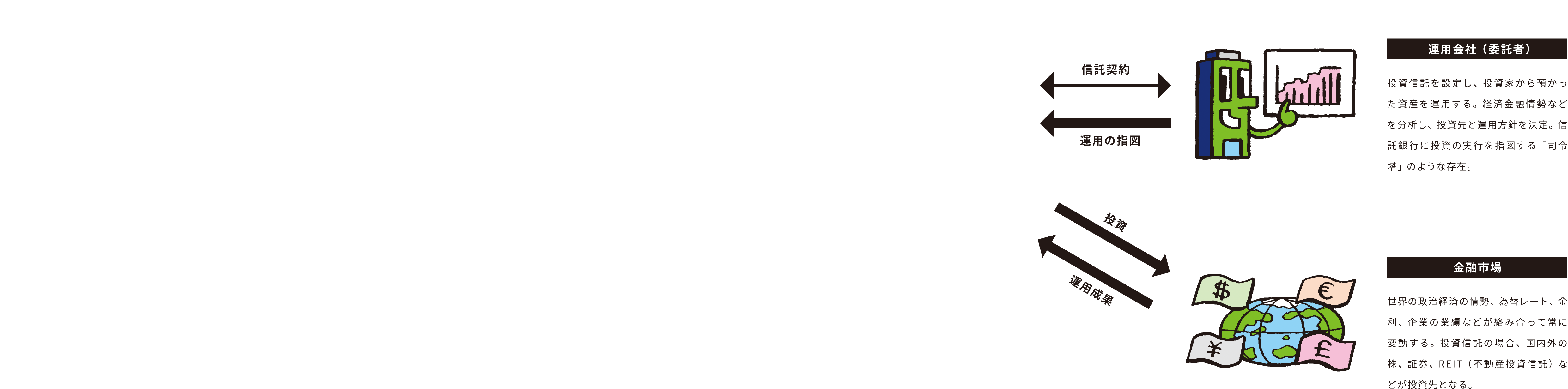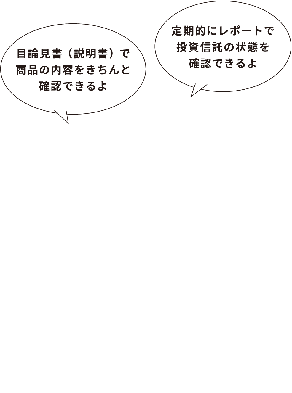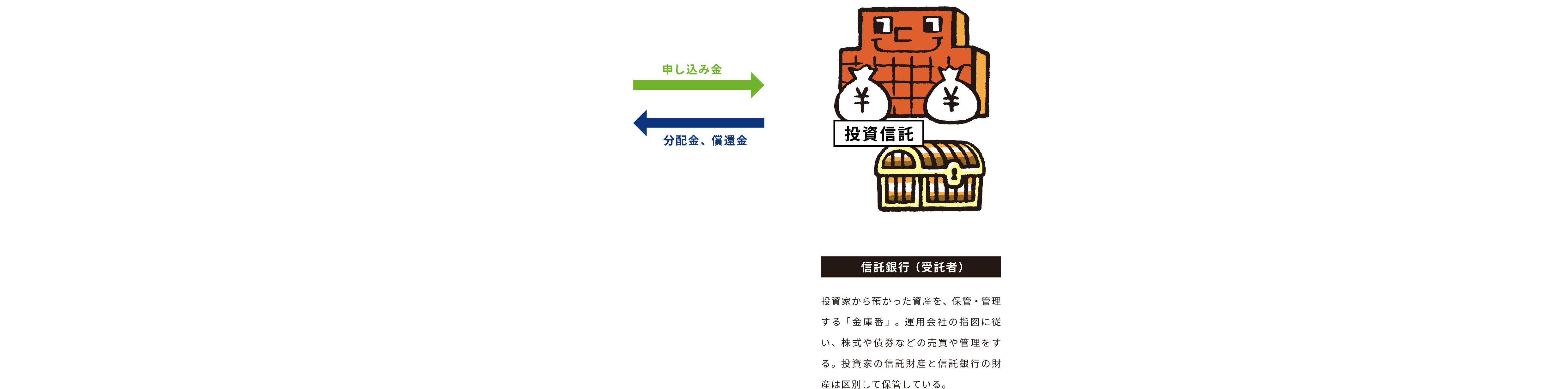 投資信託は、販売会社、運用会社、信託銀行といった各機関がそれぞれの役割分担によって成り立つ金融商品で、厳正かつ効率的な運営が行われます。仮に各機関が破たんしたとしても、投資信託の仕組み上、投資家が預けたお金は制度的に守られることになっています。投資信託の信託財産は信託銀行が管理していますが、自行の資産とは区分して管理することが義務づけられています。